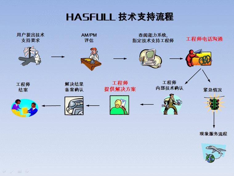 1.用户提出技术支持要求 2.AM、PM评估 3.查阅能力系统,指定技术支持工程师 4.工程师电话沟通 4.1 紧急情况 4.2 现场支持服务流程 5.工程师内部技术确认 6.工程师提供解决方案 7.解决结果,备案确认 8.工程师结案